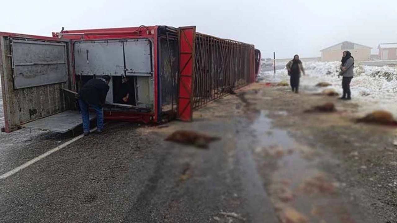 Sürücünün yaralanmadığı kazada, tır dorsesinden yola savrulan 10 küçükbaş hayvan telef oldu.
