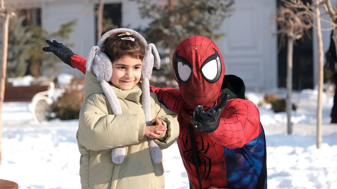 Türkiye’yi “Örümcek Adam” kostümüyle gezme hayaliyle memleketi İzmir’den yola çıkan Ayaz Salih Koç, 70’inci şehir olarak geldiği Van’da çocuklarla bir araya geldi.