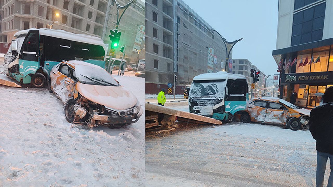 İkinisan Caddesi ile Cumhuriyet Caddesi’ni birbirine bağlayan kavşakta, plakaları ve sürücüleri henüz öğrenilemeyen mavi renkli halk otobüsü ile ticari taksi, bilinmeyen bir nedenle çarpıştı.